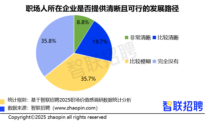 当期望照进现实,企业构建雇主品牌的具体实践值得深入探讨。数据显示,近四成职场人表示所在公司完全没有提供“清晰且可行的职业发展路径”,35.7%的职场人认为公司虽有职业发展路径但不够清晰或难以实现,仅19.7%的员工表示企业提供的发展路径比较清晰,8.8%表示非常清晰。这一现状折射出企业在人才长期培养上的短板,要提高人才留存率与组织竞争力,建议企业将人才定制化培养设计纳入战略层面,真正实现从“用工”到“育才”的战略升级。