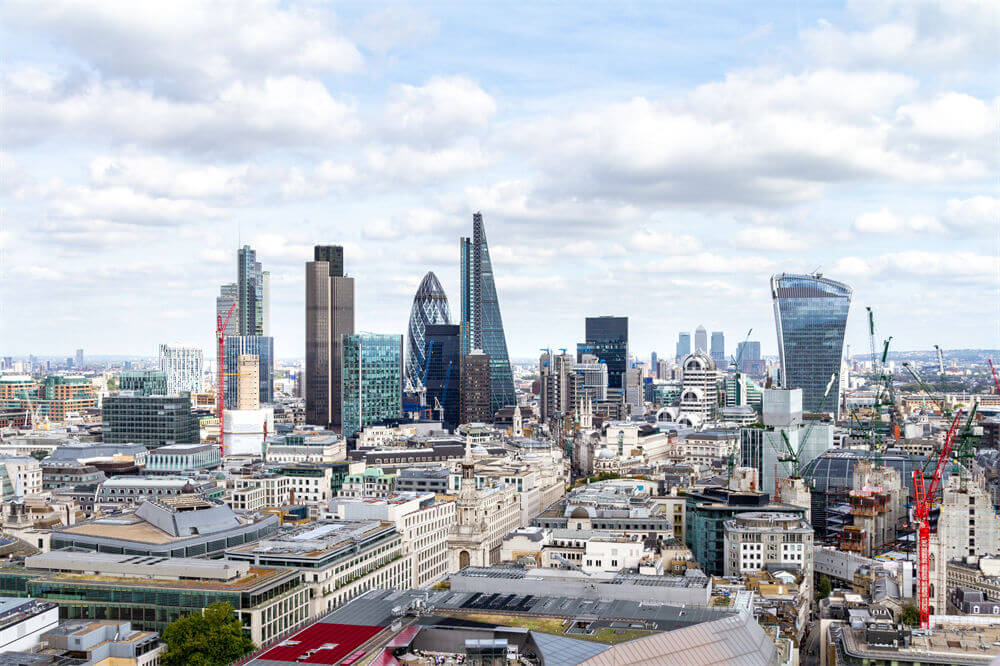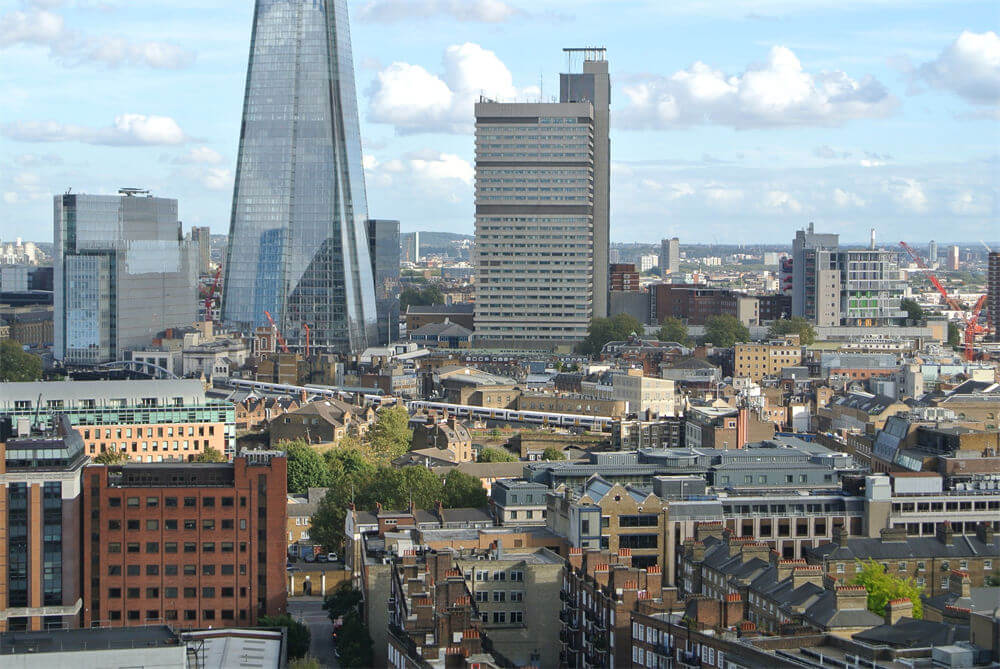 在人口稠密的地区,大部分人口集中在中高层建筑中。伦敦的摩天大楼,如圣玛丽艾克斯30号大楼、42大厦、布罗德盖特大厦(Broadgate Tower)和加拿大广场一号(One Canada Square),大多位于伦敦金融城和金丝雀码头这两个金融区。如果高层建筑会妨碍圣保罗大教堂和其他历史建筑的受保护景观,则某些地点的高层建筑开发将受到限制。尽管如此,伦敦市中心仍有许多高层摩天大楼,包括95层的伦敦碎片大厦(The Shard),这是英国最高的建筑。