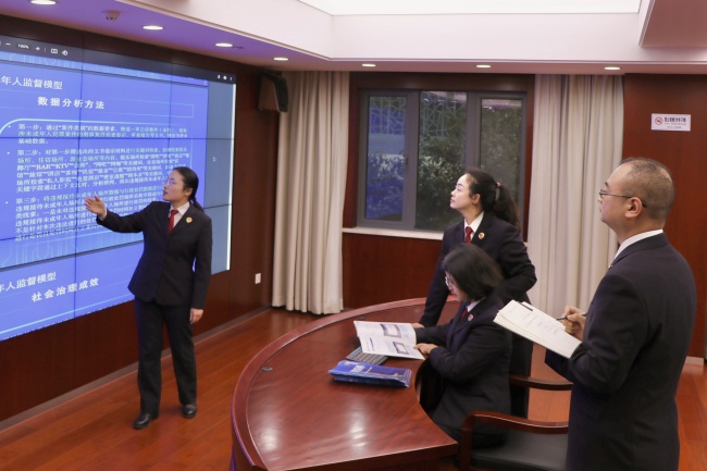 2024年11月,江苏省昆山市检察院未检部门研讨重点场所违规接待未成年人监督模型应用情况。