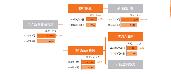 综合金融模式持续深化,截至2025年6月30日,公司个人客户数近2.47亿,较年初增长1.8%。持有集团内4个及以上合同的客户占比为26.6%,留存率达97.8%,客户黏性持续增强。
