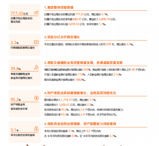 中期分红提升至每股0.95元,同比增长2.2%,延续了平安稳定的股东回报政策。此次分红增长反映了公司良好的现金流生成能力和对未来业绩增长的信心。
