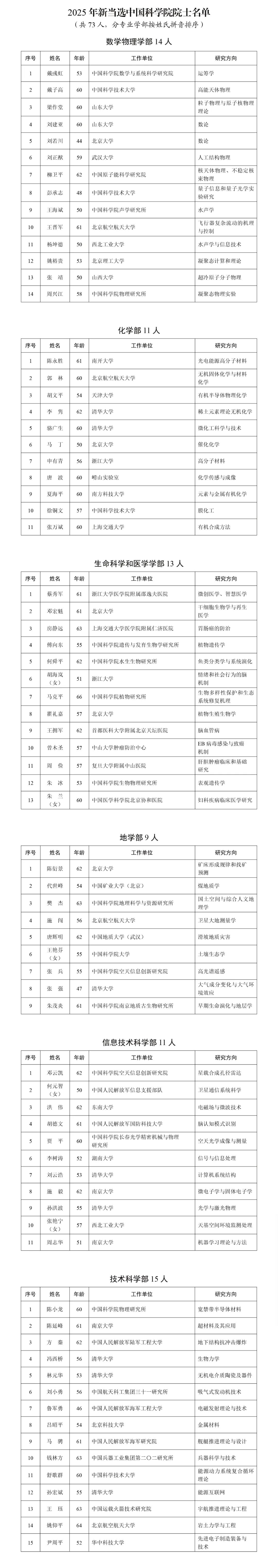 当选中国科学院院士的73人中,数学物理学部14人,化学部11人,生命科学和医学学部13人,地学部9人,信息技术科学部11人,技术科学部15人。新当选院士平均年龄57.2岁,最小年龄44岁,最大年龄66岁,60岁(含)以下的占67.1%。女性科学家有5人当选。