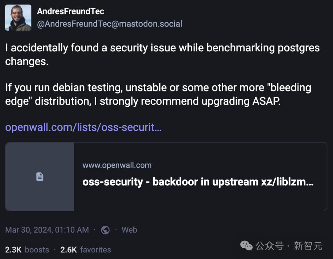 【新智元导读】这个周末,开源软件xz后门事件,直接引发了安全界地震!一段恶意代码被悄悄植入了,险些波及各大Linux系统。好在,或许是因为攻击者疏忽了,目前并未造成严重后果。但如果后门没被及时发现 ,结果将是灾难性的……