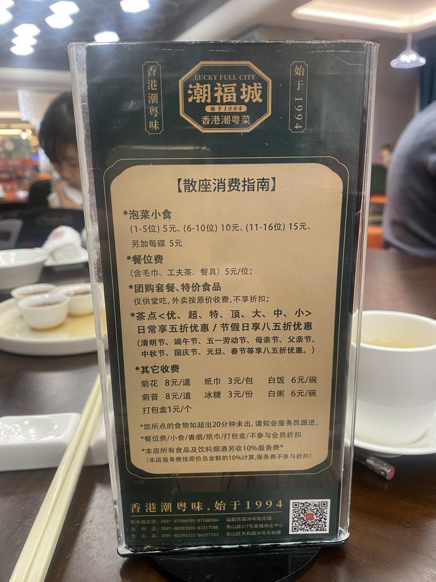 福州潮福城酒楼有限公司是一家成立了30余年的老餐饮企业,但也有顾客吐槽其收费不合理。3月15日晚,记者一行3人来到该公司位于福州市福新路的潮福城大酒楼阳光城总店。这家店把各种收费都写得明明白白,主要有小食费、餐位费、服务费3种收费。桌面上的“散座消费指南”写着:泡菜小食(1位至5位)5元;餐位费(含毛巾、功夫茶、餐具)5元/位。备注上标明:餐位费不参与会员折扣;本店所有食品及饮料烟酒按原价另收10%的服务费(服务费按原价总额的10%计算,不参与折扣)”。记者尚未点菜,服务员就将2碟小食、湿热毛巾、餐具端放在桌面。得知小食收费,记者明确表示不需要后,服务员最终同意了,将小食撤下。记者又问,不要功夫茶,可以不用支付餐位费吗?服务员明确表示不用茶也要收,并声称餐位费除了包括功夫茶的费用,还包含餐具、毛巾的费用。记者看了看餐具,是商家自备的餐具,不付费将无法饮用,只得同意。记者提问,服务费主要包括哪些内容,服务员表示迎宾入客、上菜、餐中服务,都属服务范畴,并表示港式餐厅都有这些服务收费。