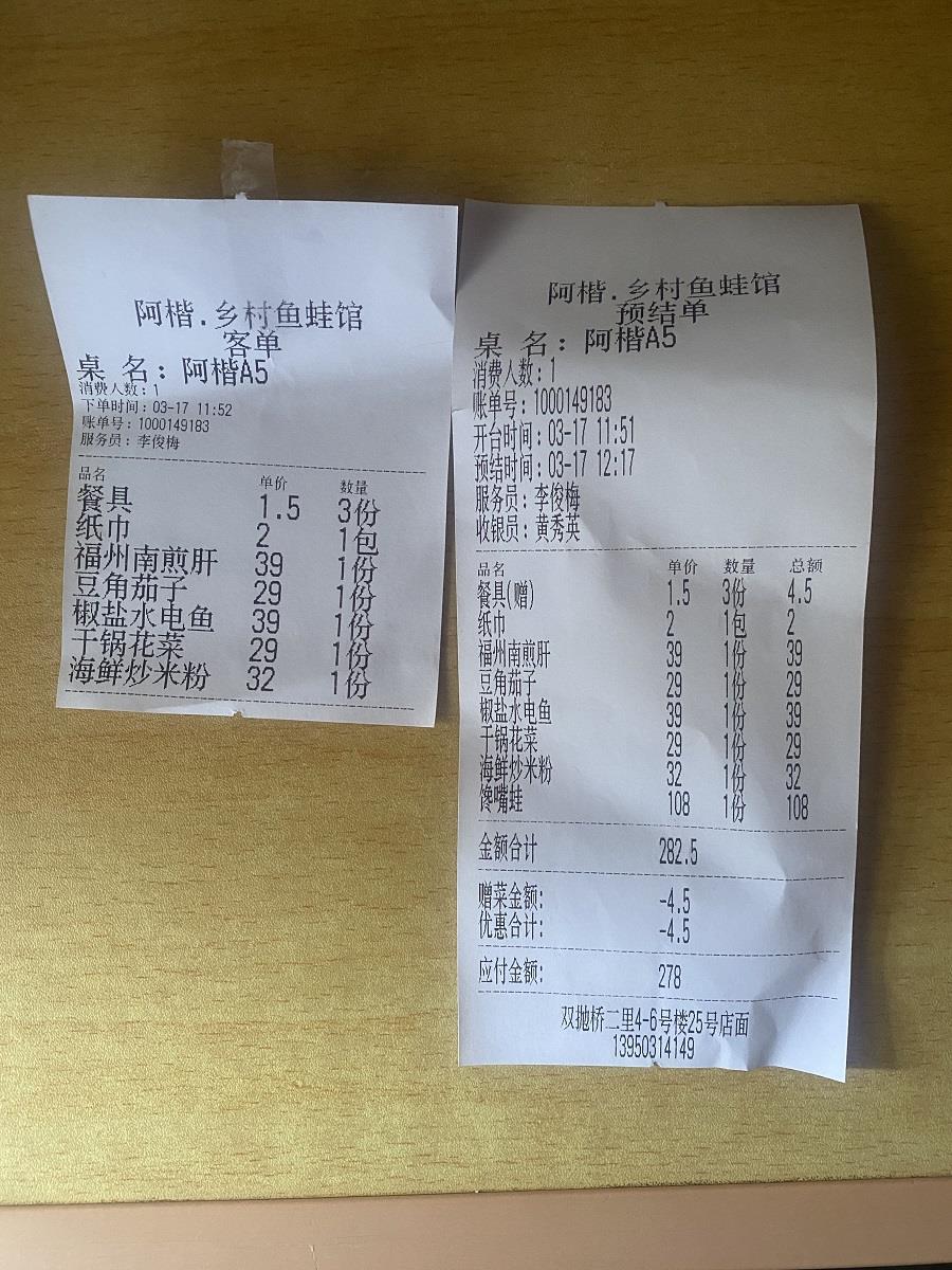 3月17日中午,记者一行3人在阿楷乡村鱼蛙馆点餐消费,从点餐开始至结束,餐馆服务员自始至终未提示要收取餐具费用,但点餐结束后,服务员便将一份预结单贴在纸盒上,并将其放置在桌面,记者一看,预结单上赫然写着“餐具 单价1.5元 3份”,并未说明是消毒费。埋单时,记者特地指着预结单上的餐具费问,这餐具费用是4.5元对吧?收银员回复说,对。记者又问,那餐具归我对吧?服务员一怔,没有,那是.....停了一会说,那我看一下哈,在电脑上一阵输入后,她告诉记者,这是统计数量的,现在给您退掉,没有收费。随后给记者了一张收费小票,餐具费后面加了“赠”字,总费用为282.5元,扣去“赠菜金额”4.5元,记者支付了278元。