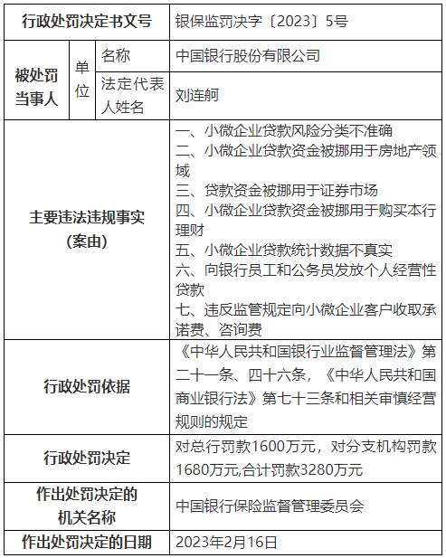 中国经济网北京2月18日讯 银保监会网站昨日公布的行政处罚信息公开表(银保监罚决字〔2023〕5、6、7号)显示,中国银行股份有限公司存在以下违法违规事实:一、小微企业贷款风险分类不准确;二、小微企业贷款资金被挪用于房地产领域;三、贷款资金被挪用于证券市场;四、小微企业贷款资金被挪用于购买本行理财;五、小微企业贷款统计数据不真实;六、向银行员工和公务员发放个人经营性贷款;七、违反监管规定向小微企业客户收取承诺费、咨询费。