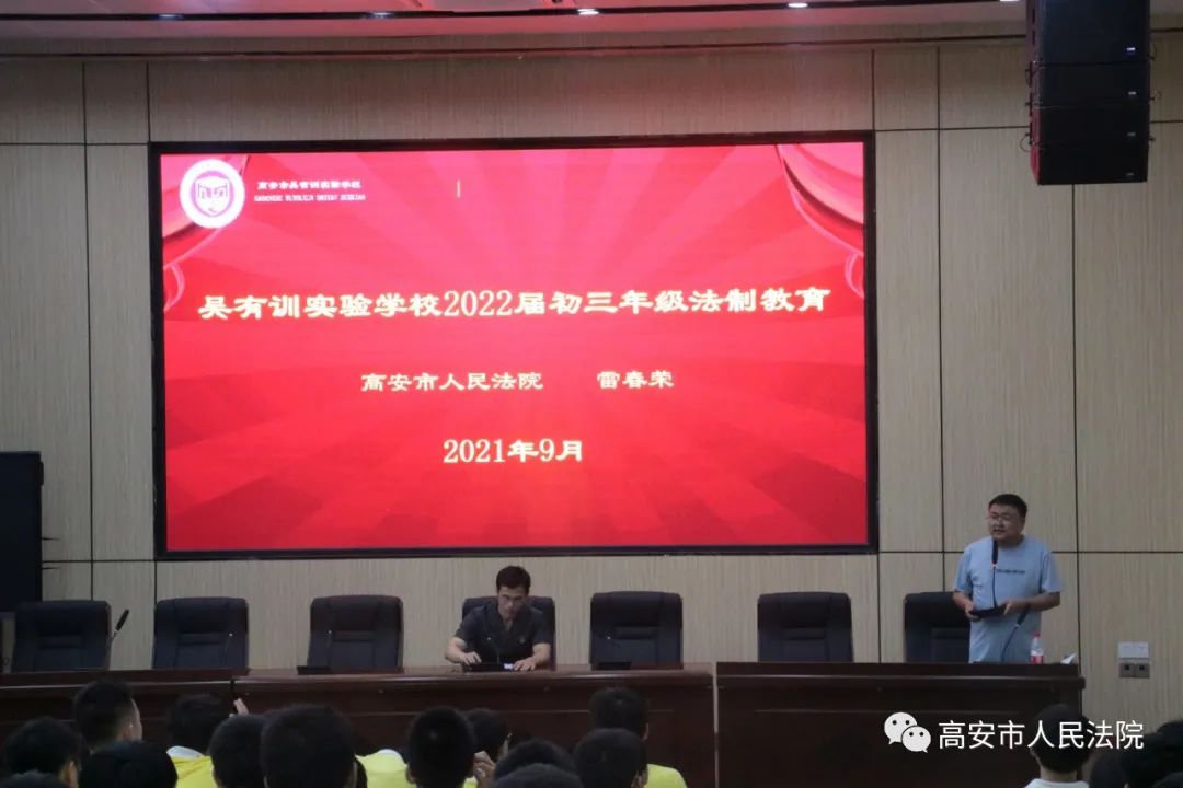 9月27日,高安市人民法院法官来到吴有训实验学校,向该校初三年级学生上了一堂法治理教育课,课堂旨在通过讲解法律知识,增强青少年学生对法律法规的了解,在青少年群体中播下法治的种子,促进形成初步的法治概念,争做新时代法治社会好青年。