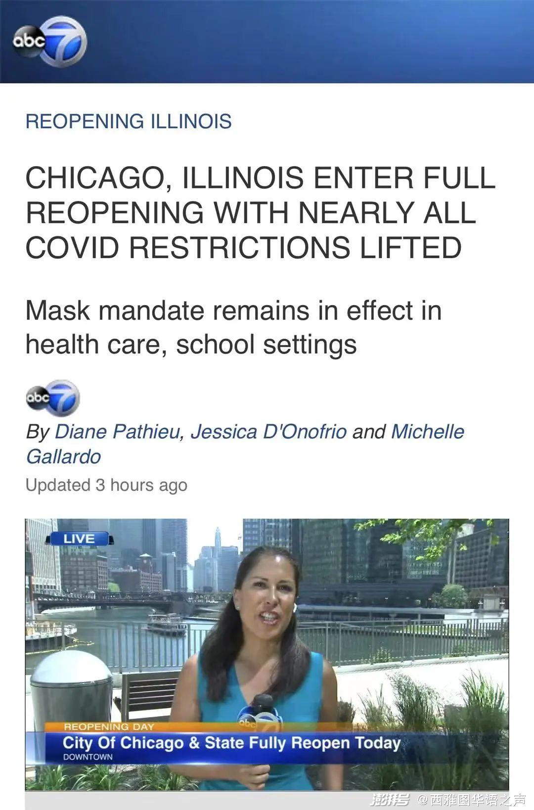 【ABC】伊利诺伊州和芝加哥正式全面开放,新冠相关的限制几乎完全取消,不过在医疗机构和学校内仍然继续执行口罩令。