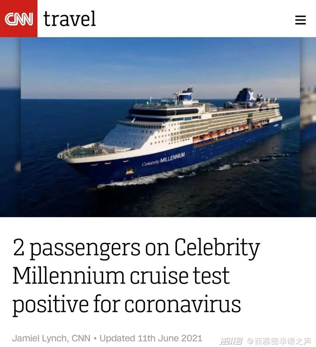 美国疫情后首航的游轮Celebrity Millennium,在7日行程结束的检测中,有两名乘客新冠检测呈阳性,但无症状,已隔离;该游轮上所有员工和除儿童外的乘客都已完全接种,所有人在出发前必须出示新冠阴性证明,游轮上有约500名乘客,邮轮公司表示严格的健康安全规程可以保护船员和乘客的健康。