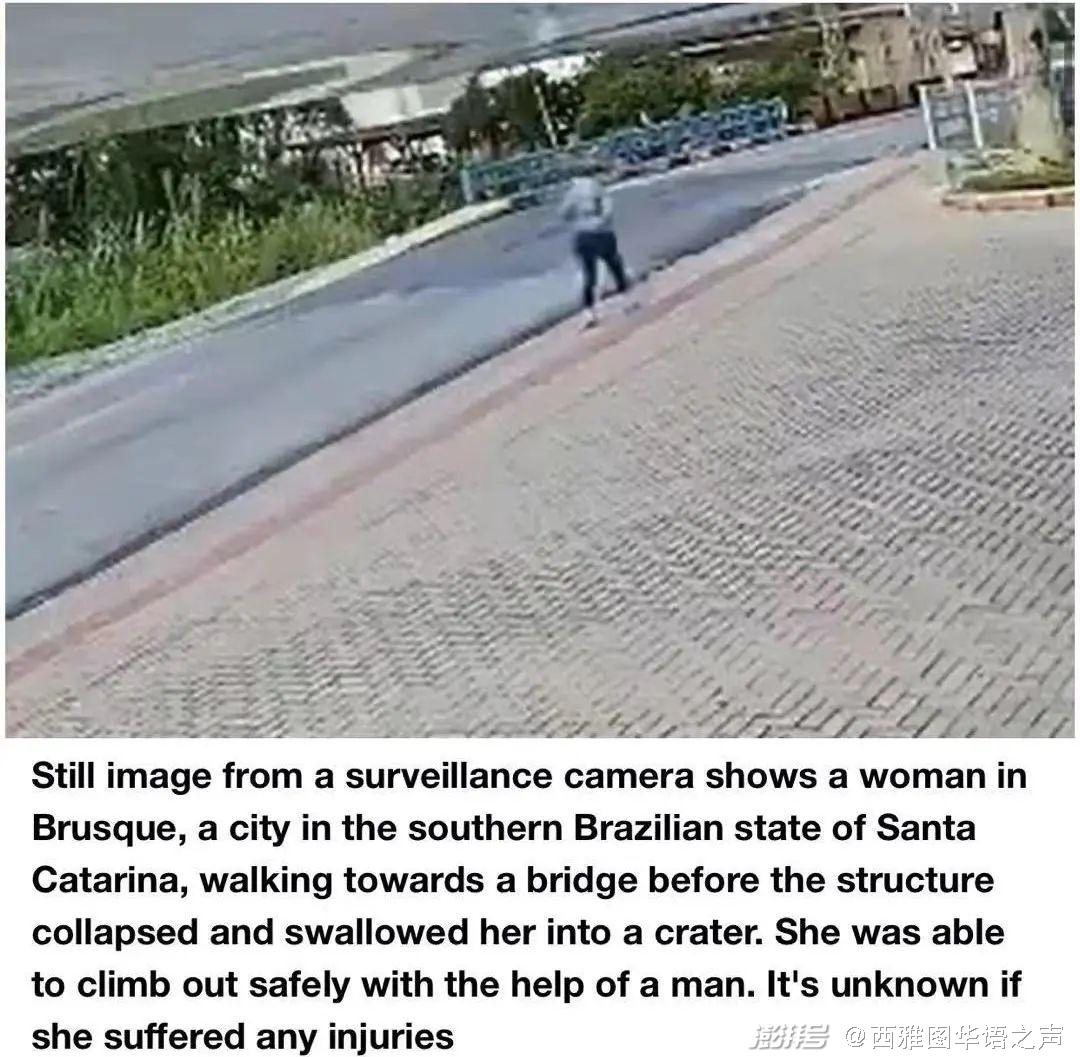 【每日邮报】据报道,当地时间6月9日,在巴西圣卡塔琳娜州的布鲁斯基,一座公路桥突然断裂坍塌,一名路过的女子掉了下去。视频显示,这名女子正走上大桥,桥上一辆蓝色卡车似乎因桥面不平弹跳了几下,卡车经过后整座桥突然坍塌,刚走上桥面的女子掉进了坑里。桥对面另一辆白色卡车及时停住了车。