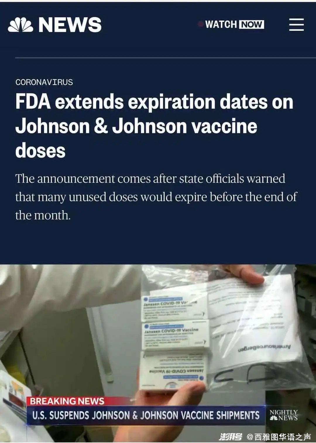 【综合讯】据报道,强生公司10日表示,美国食品和药物管理局(FDA)将其新冠疫苗的有效期延长了六周,美国药监局是在州官员警告说许多未使用的强生疫苗将在本月底前到期之后发布这一公告的。此举被认为有助于缓解对于数百万剂即将到期的强生疫苗的担忧。美国药监局10日表示,强生疫苗的保质期从原先的3个月改为4个半月。