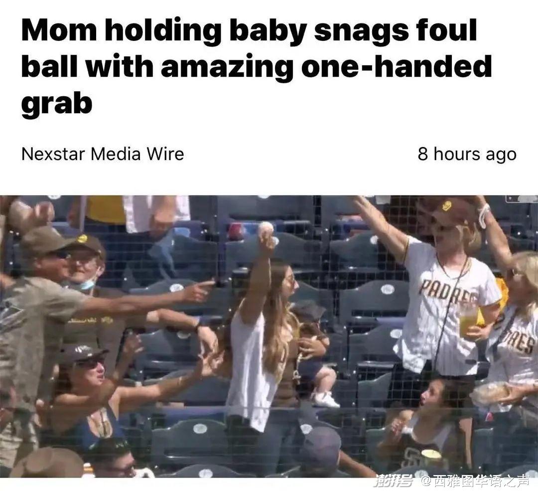 【镜报】据报道,近日,美国一场棒球比赛中,球员不小心将球打向看台,棒球被看台的台阶反弹起来,又落向地面,然后一名怀抱婴儿的妇女伸手一把抓住了棒球。