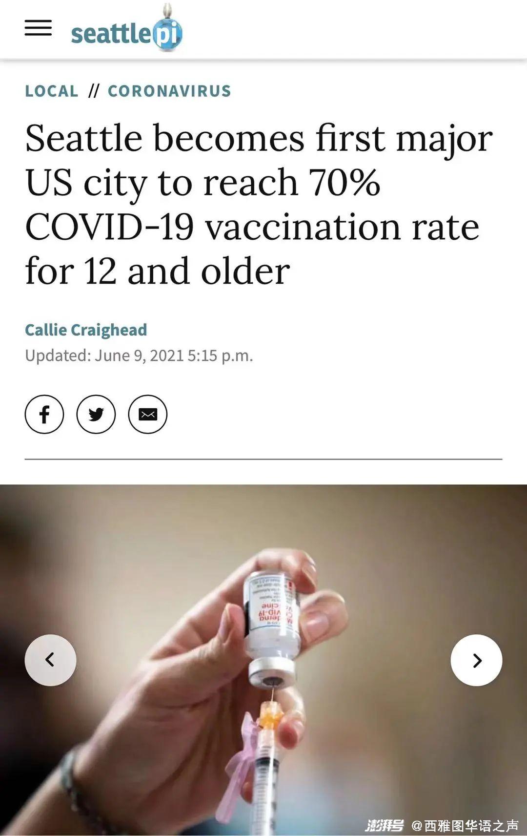 西雅图市长宣布,西雅图是美国第一个12岁和以上人士新冠疫苗完全接种率达70%的主要城市,目前该市78%12岁和以上的人士已经开始了免疫接种程序,接种率超过旧金山。