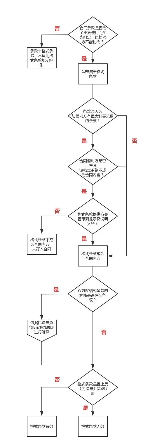通过上述格式条款规制规则的更新,《民法典》与《合同法》及其司法解释相比有了显著不同。为了便于读者理解,本文以图表展示《民法典》格式条款各条文在适用上的逻辑关系,如下图所示。