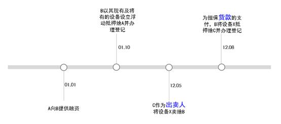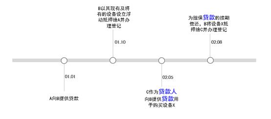 在上述场景中,假设416条款中“其他担保物权人”为浮动抵押权人,具体为:基于1月1日A向B提供的贷款,B将其现有及将有的所有设备设立浮动抵押给A并办理了抵押登记;后C作为贷款人于2月5日向B提供贷款用于购买设备X并在2月8日办理抵押登记;在上图所示情形下,标的物上存在两个抵押权竞合的情况,分别是1月10日A设立的浮动抵押因其“嗣后财产性”自动及于“流入”标的物、以及2月8日C作为贷款人在标的物上设立的动产抵押。