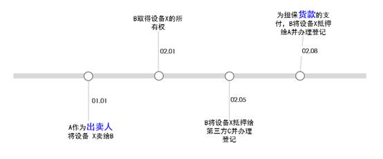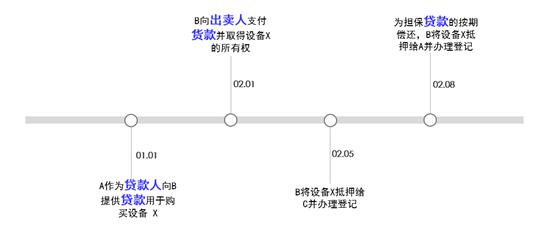 在上述场景中,假设416条款中“其他担保物权人”为固定抵押权人,具体为:1月1日A作为贷款人向B提供的贷款,B在向出卖人支付完毕货款后应将标的物(即设备X)抵押给A并办理抵押登记;然而B在2月5日即将标的物抵押给第三方C之后,方于2月8日将标的物抵押给A;在上图所示情形下,标的物上存在两个抵押权竞合的情况,分别是2月5日C设立的抵押权及2月8日A作为贷款人在标的物上设立的抵押权。