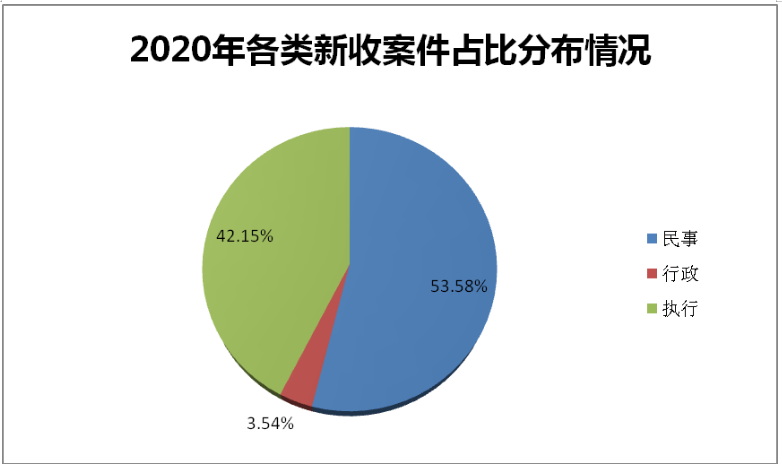 全院新收案件中,民事案件1544件(含非讼案件),占全部新收案件的53.99%;行政案件102件(含非诉审查案件),占全部新收案件的3.57%;执行案件1214件,占全部新收案件的42.45%。