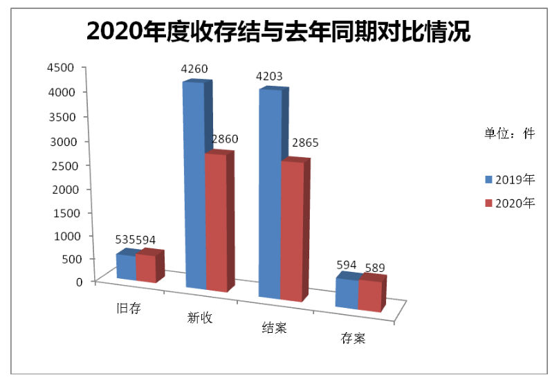 1.新收案件数量同比大幅下降。自2015年人民法院立案登记制实施以来,除2019年外,我院各年新收案件数在2500件至3500件区间变动,今年新收案件数量亦在该区间中,虽同比2019年历史最高的新收案件数4260件,大幅下降32.86%,但今年新收案件数2860件仍属于正常收案水平。