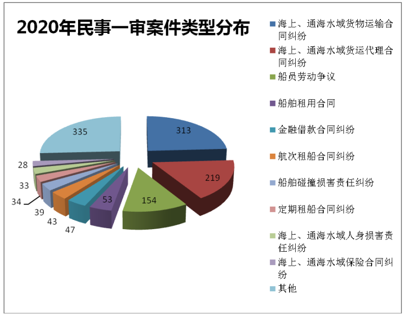 新收的1298件民事一审案件,共涉及案由类型93类,其中新收数量居前三位案件类型分别为海上、通海水域货物运输合同纠纷、海上、通海水域货运代理合同纠纷和船员劳动争议纠纷。