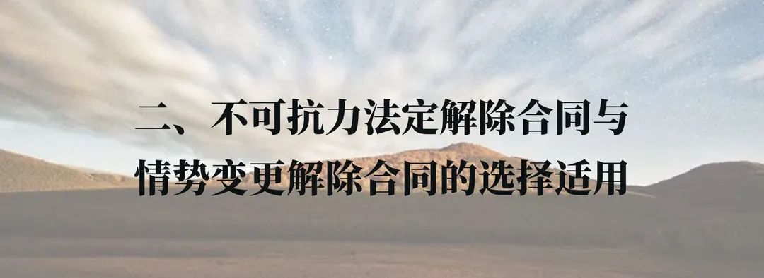 但是,不可抗力作为民法中的一般免责事由,其制度设计的目的在于使当事人避免承担意外之责,在司法实践中,在不可抗力构成情势变更时,当事人可以根据案件具体情形,选择适用《民法典》第563条的法定解除与第533条规定的情势变更解除。