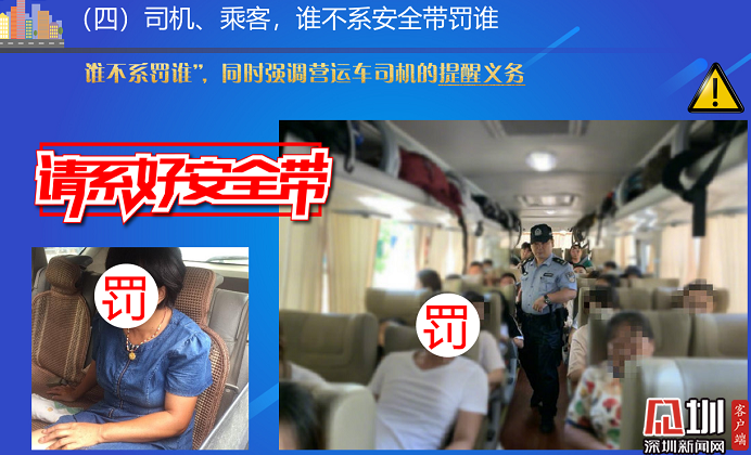 (四)处罚不系安全带有新规:谁不系罚谁,并强调营运司机提醒乘客的义务,否则予以处罚。