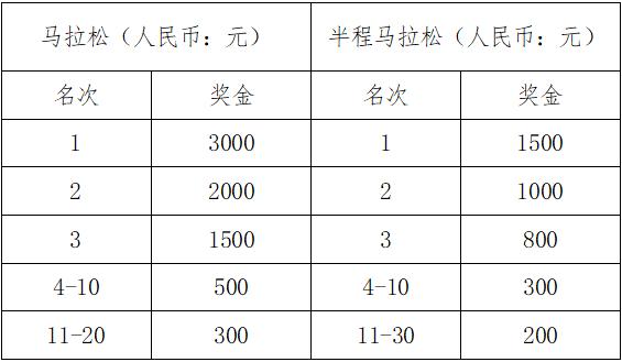 2.赛事为公开组马拉松、半程马拉松男、女前三名选手分别颁发奖杯一座、奖牌一枚;