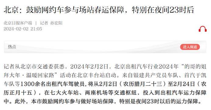 其中北京出租车行业启动“的哥的姐拜大年·温暖回家路”活动,在七大火车站、两座机场等交通枢纽,投入到出租汽车运力保障中。同时鼓励网约车参与做好场站保障,特别是夜间23时以后的运力保障。