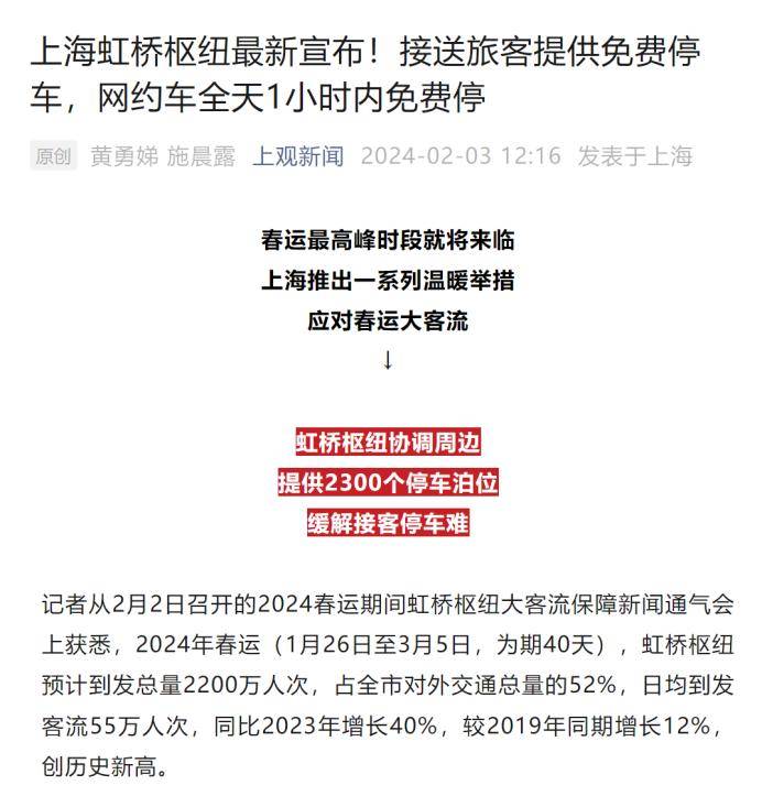 2月3日,虹桥枢纽将网约车列入春运期间加强运力调度的保障方案。为了缓解春运“接客停车难”问题,上海虹桥枢纽统筹提供周边虹桥天地、虹桥天街、虹桥汇、虹桥绿谷、正荣中心等5个商业及办公停车场共2300个停车泊位,从晚上9点到早上6点提供免费停车一小时服务,接送旅客的网约车可实现全天1小时内免费停。