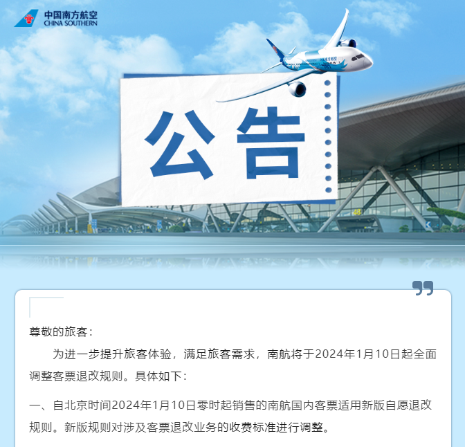 2024年1月4日,中国南方航空在微信号发布公告,南航将于1月10日起全面调整客票退改规则。其中提到,进一步扩大误操作免费退改范围。针对购票时航程、日期、舱位等信息填写错误。符合一定条件下可给予免费办理错购客票退票。