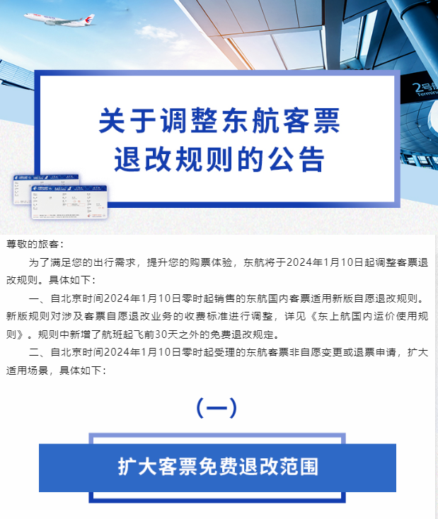 2024年1月5日,中国东方航空在微信号发布公告,1月10日零时起销售的东航国内客票适用新版自愿退改规则。规则中新增了航班起飞前30天之外的免费退改规定。