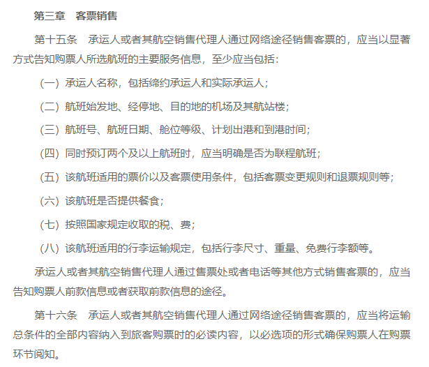 此外,交通运输部2021年印发《公共航空运输旅客服务管理规定》对航司、票代等多个方面作出规定,承运人或者其航空销售代理人通过网络途径销售客票的,应当以显著方式告知购票人所选航班的主要服务信息,至少应当包括航班号、航班日期、舱位等级、计划出港和到港时间;该航班适用的票价以及客票使用条件,包括客票变更规则和退票规则等。