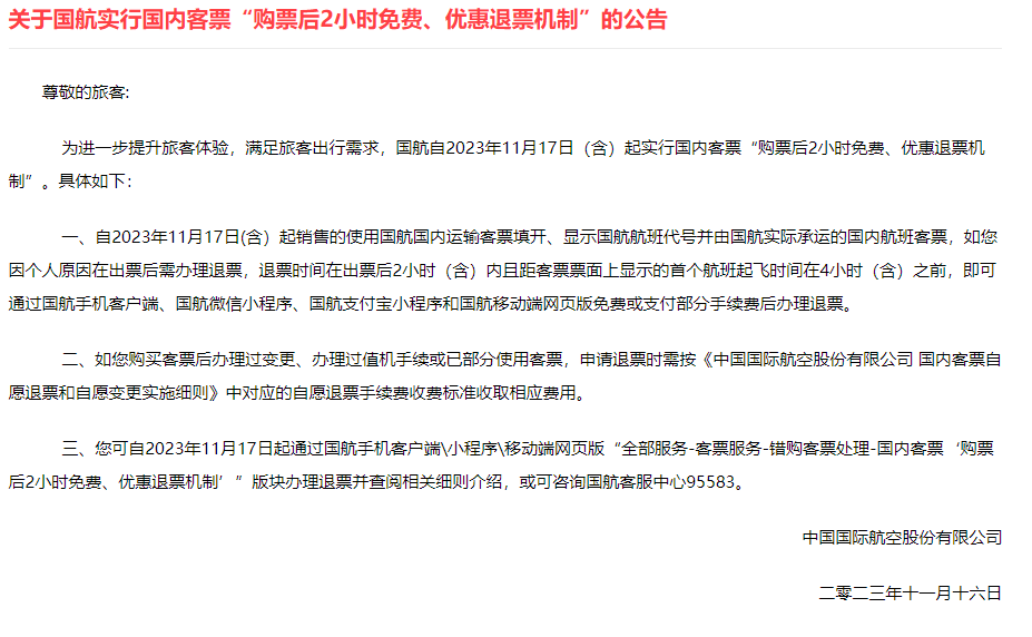 2023年11月16日,中国国际航空官网发布公告称,11月17日起实行国内客票“购票后2小时免费、优惠退票机制”。如因旅客个人原因在出票后需办理退票,退票时间在出票后2小时(含)内且距客票票面上显示的首个航班起飞时间在4小时(含)之前免费或支付部分手续费后办理退票。