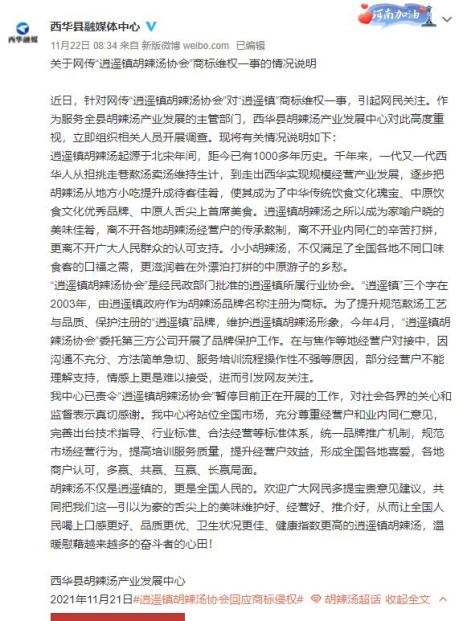 11月21日,针对逍遥镇胡辣汤协会对“逍遥镇”商标维权一事,西华县胡辣汤产业发展中心发布情况说明,称目前已责令协会暂停目前正在开展的工作。