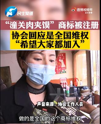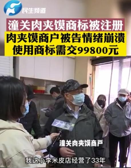 据河南广播电视台《大参考》报道,11月21日,河南几十家小吃店的商户们求助,称他们卖的肉夹馍因带“潼关”俩字,被陕西“潼关肉夹馍协会”告了,要求他们赔偿3至5万元不等,想要使用“潼关肉夹馍”这个商标,需缴纳99800元。商户们告诉记者,和他们有类似经历的小吃店,全国有上百家。