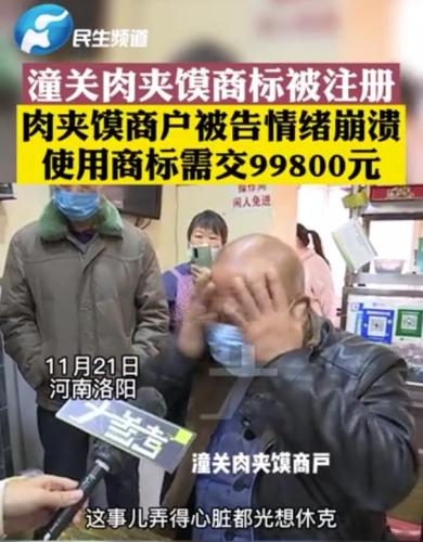 11月21日,在河南洛阳,几十家肉夹馍小吃店的商户反映说,他们卖的肉夹馍因为带有“潼关”二字,被陕西渭南的“潼关肉夹馍协会”告上了法庭,让他们赔偿3万到5万元的侵权费,如果想继续使用“潼关肉夹馍”字样,必须缴纳99800元。