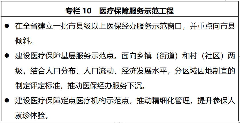 三是理顺医保管理体系。成立市、县医疗保障行政部门和经办管理服务中心,在乡镇、村设立医保派出机构或人员,形成全省统一的医保管理体系。推进城乡居民医保基金、城镇职工医保基金和生育保险市级统筹,充分发挥基金大数效应。
