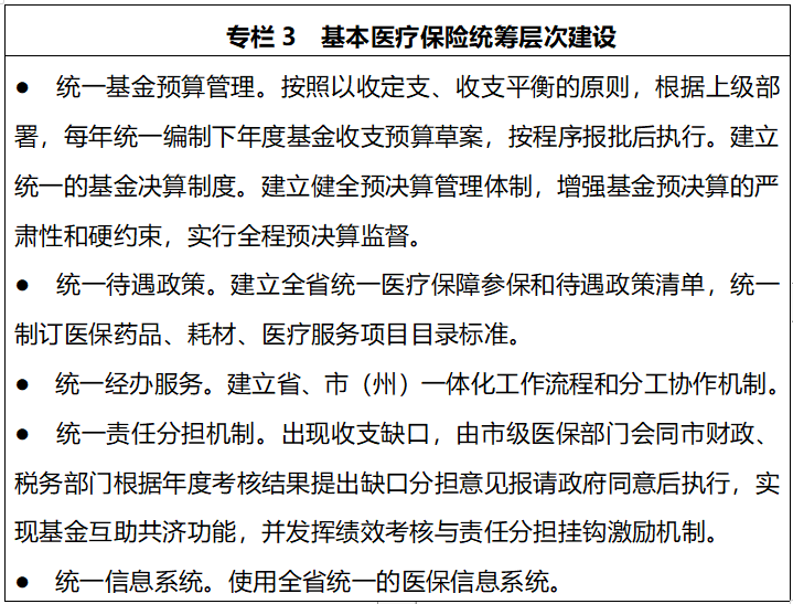 全面做实基本医疗保险和生育保险市级统筹。促进医疗救助统筹层次与基本医疗保险统筹层次相协调。切实提高基金共济能力、抗风险能力,制度运行更加安全平稳,更好满足参保群众基本医疗保障需求。探索推进市级以下医疗保障部门垂直管理。适时推进省级统筹。