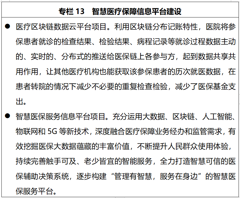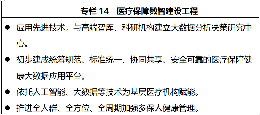 ——建设智慧医保。医保数字化发展加快,信息化标准化基础全面加强,经办服务能力得到提升。开放共享应用水平显著提高,大数据、人工智能、物联网、区块链等技术在医疗保障管理服务中逐步应用,医保电子凭证普遍应用,智能监管全面推广,传统服务方式和智能化服务共同发展,政务服务事项线上办理率明显提高,就医结算更加便捷,医保服务让人民更加满意。
