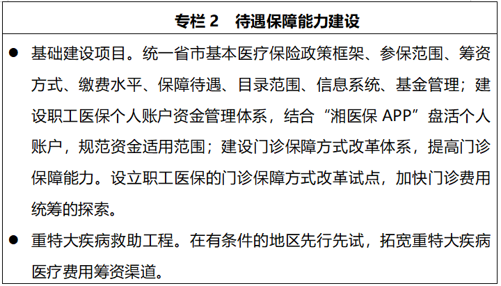 坚持和完善覆盖全民、依法参加的基本医疗保险制度和政策体系。进一步完善和规范居民大病保险、职工大额医疗费用补助等补充医疗保险,提高重特大疾病保障水平。坚持医疗保险公平性原则,坚持职工和居民分类保障,待遇与缴费挂钩,职工与居民医保基金分别建账、分账核算。统一基本医疗保险统筹层次,规范医保支付政策确定办法。改革职工基本医疗保险个人账户,逐步将门诊医疗费用纳入基本医疗保险统筹基金支付范围,建立健全门诊共济保障机制。进一步拓展个人账户功能,充分激发个人账户在“防未病”上的积极作用,扩展保障对象、拓宽保障范围,提高个人账户互助共济能力,实现家庭成员共享、功能范围扩展。制定《湖南省医疗救助办法》,健全统一规范的医疗救助制度,增强医疗救助托底保障功能。建立医疗与医保协同发展,实现医疗保障制度可持续发展的补偿机制。