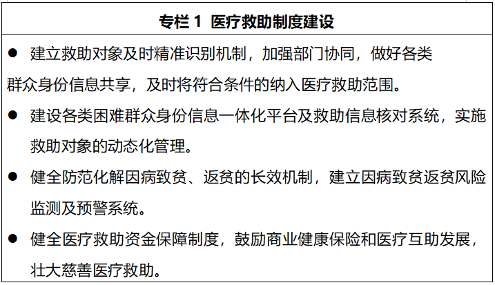 完善统一规范的救助制度,及时精准识别救助对象,实施分类分层救助。规范救助费用范围,合理确定救助标准,夯实救助托底保障功能。整合医疗保障、社会救助、慈善帮扶等资源,实施综合保障,不断改善罕见病患者用药保障,减轻用药负担。探索建立防范因病致贫返贫的长效机制,支持慈善救助等社会力量积极参与,筑牢医疗托底保障防线。