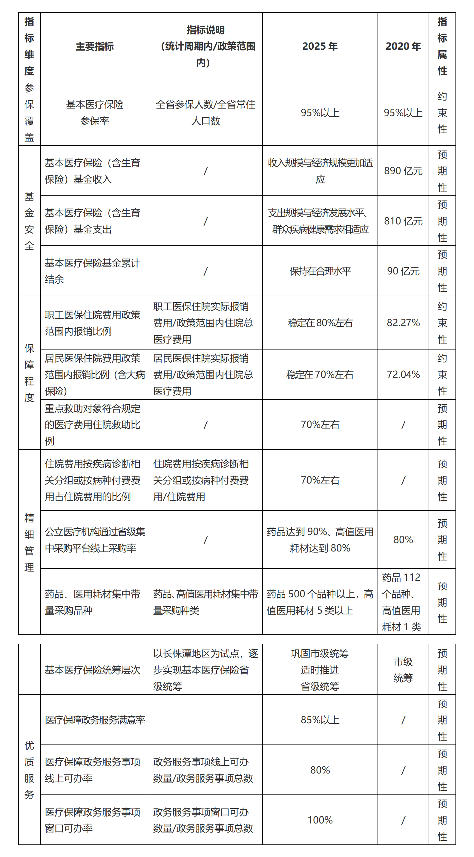 按照国家医保局和省委、省政府的统一部署,到2025年,我省医疗保障制度更加成熟定型,从贯彻落实新发展理念角度着重处理好保障与持续、管理与服务、统筹与创新、治已病与治未病、内部与外部五大关系,在优化资源配置、防范化解风险、推动供给侧结构性改革等方面主动融入双循环新发展格局,基本完成待遇保障、筹资运行、医保支付、基金监管等重要机制和医保管理服务等关键领域的改革任务。具体达成以下建设目标: