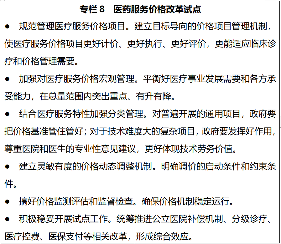 建立适应经济社会发展、更好发挥政府作用、医疗机构充分参与、体现技术劳务价值的医疗服务价格形成机制。完善医疗服务价格项目编制,加快审核新增医疗服务价格项目。进一步简化审核工作程序,明确受理条件、审核程序、审核时间和审核原则,研究建立优先审核通道。咨询权威医疗机构和医学专家,设立价格管理专家库。建立价格合理确定、动态调整机制,持续优化医疗服务价格和医药费用结构,逐步理顺医疗服务性比价关系。降低价格虚高的检查检验和大型医用设备检查治疗项目价格,逐步提高诊疗、手术、康复、护理、中医等体现技术劳务价值的医疗服务价格。