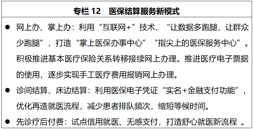 推进医保全流程数字化服务。推动人工智能、大数据、物联网、云计算、区块链等新技术在医保管理中的运用。鼓励发展诊间结算、床边结算、线上结算。依托医保诚信记录,逐步推广先诊疗后付费,发展医保电子病历,推进医疗电子票据使用。鼓励有条件的地区探索建立慢性病互联网诊治、第三方药品配送上门的服务新模式。