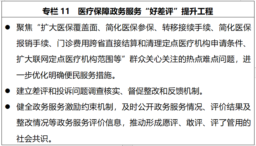 ——建设协同医保。多层次医疗保障作用协同发挥,各类保障有机衔接,医疗保障和医药服务高质量协同发展。医保基金战略购买作用进一步发挥,资源配置功能更加强化,医保支付机制更加管用高效,以市场为主导的药品价格形成机制更加完善,医疗服务价格更加灵敏高效,结构更加科学合理。带量采购、支付方式改革等工作常态化推进,医保改革更加精准有效。
