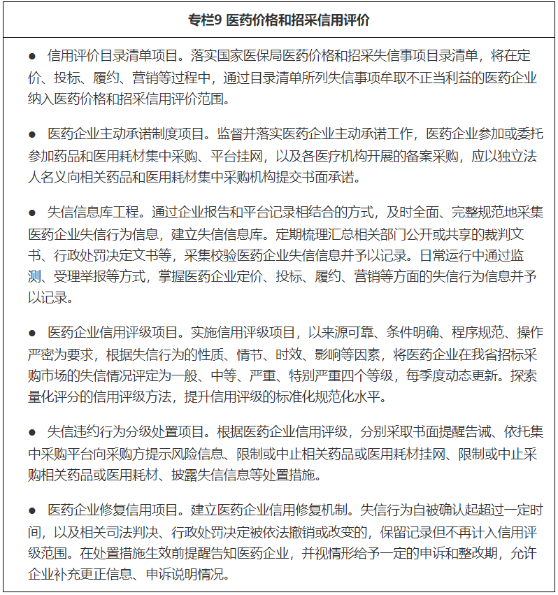 ——建设诚信医保。参保单位、定点医药机构、药品耗材供货和配送企业和参保人员医保信用记录更加完善,信用修复机制更加健全,守信联合激励和失信联合惩戒机制等举措不断落实,医保系统社会信用体系建设得到加强,医保信用体系建设更加制度化、规范化。