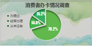 线上参与者中,70.2%的消费者办理过,14.6%的消费者经常办理,15.2%的消费者从来没有,近85%的消费者办理过预付式卡。