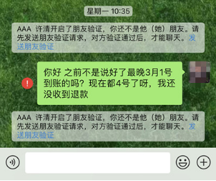 (二)商家同意退卡却未按照约定时间将款项退还或退款流程时间过长。部分商家虽然答应了退款,并且书面承诺了最晚退款到账时间,但是并未按时兑现承诺。例如南京小美汇某店,承诺最晚3月1日退款,但是体察人员4日联系对方店长时发现对方已删除微信好友,拨打客服电话后,客服表示没有店长手机号,无法联系上店长。最终经多次交涉后对方于3月8日完成退款。