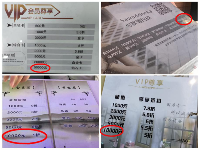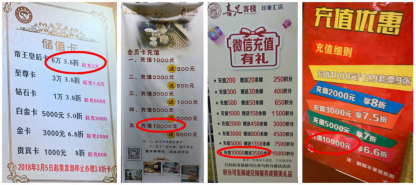 部分记名卡样本预收款金额远超法律规定的5000元限额,如南通永琪美容美发某店、南京泰合玺某店宣传单页上就写着最高充值金额为5万元,常州王宇州某店悬挂在收银台后方的储值卡介绍中,最高金额达6万元。调查中还有一些虽未通过宣传单页等形式直接展示预收款金额,但是通过询问工作人员了解到也存在超额情况,甚至部分商家表示“充值金额上不封顶”。