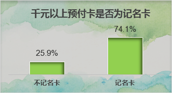 办理过的单张额度超过1000元预付卡中,74.1%的消费者表示该预付卡为记名卡,25.9%的消费者是不记名卡。也就是说25.9%的消费办理的不记名卡金额都超过了限额。