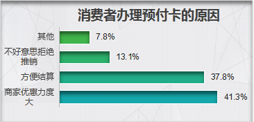 其中,41.3%的消费者办卡的原因是商家优惠力度大,37.8%认为方便结算,13%不好意思拒绝商家的推销,还有7.8%的消费者因为其他原因选择办卡。
